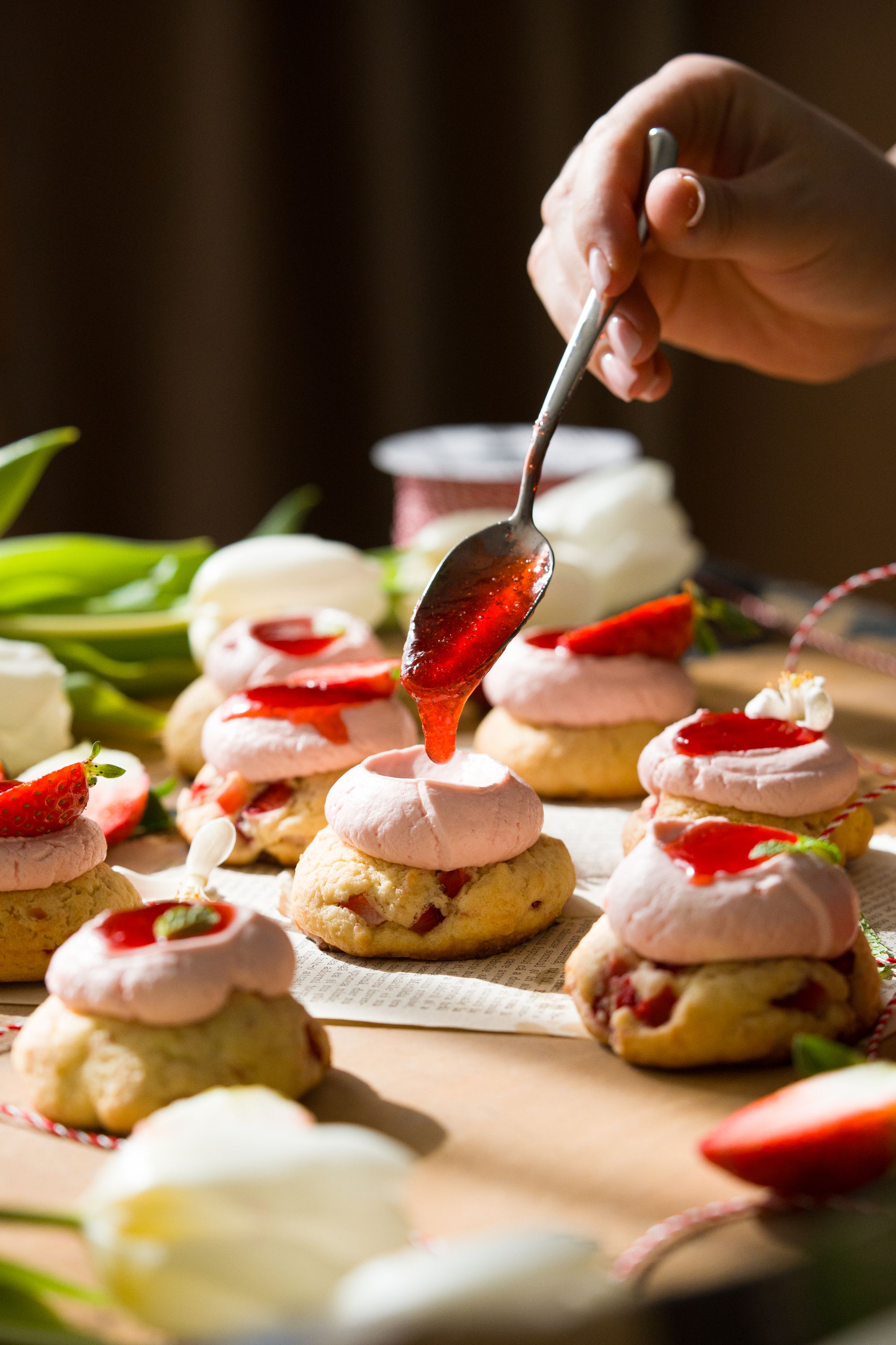 - Poșați cremă pe fiecare biscuit răcit, faceți un spațiu mic cu o linguriță încălzită, apoi puneți o linguriță de gem de căpșuni.