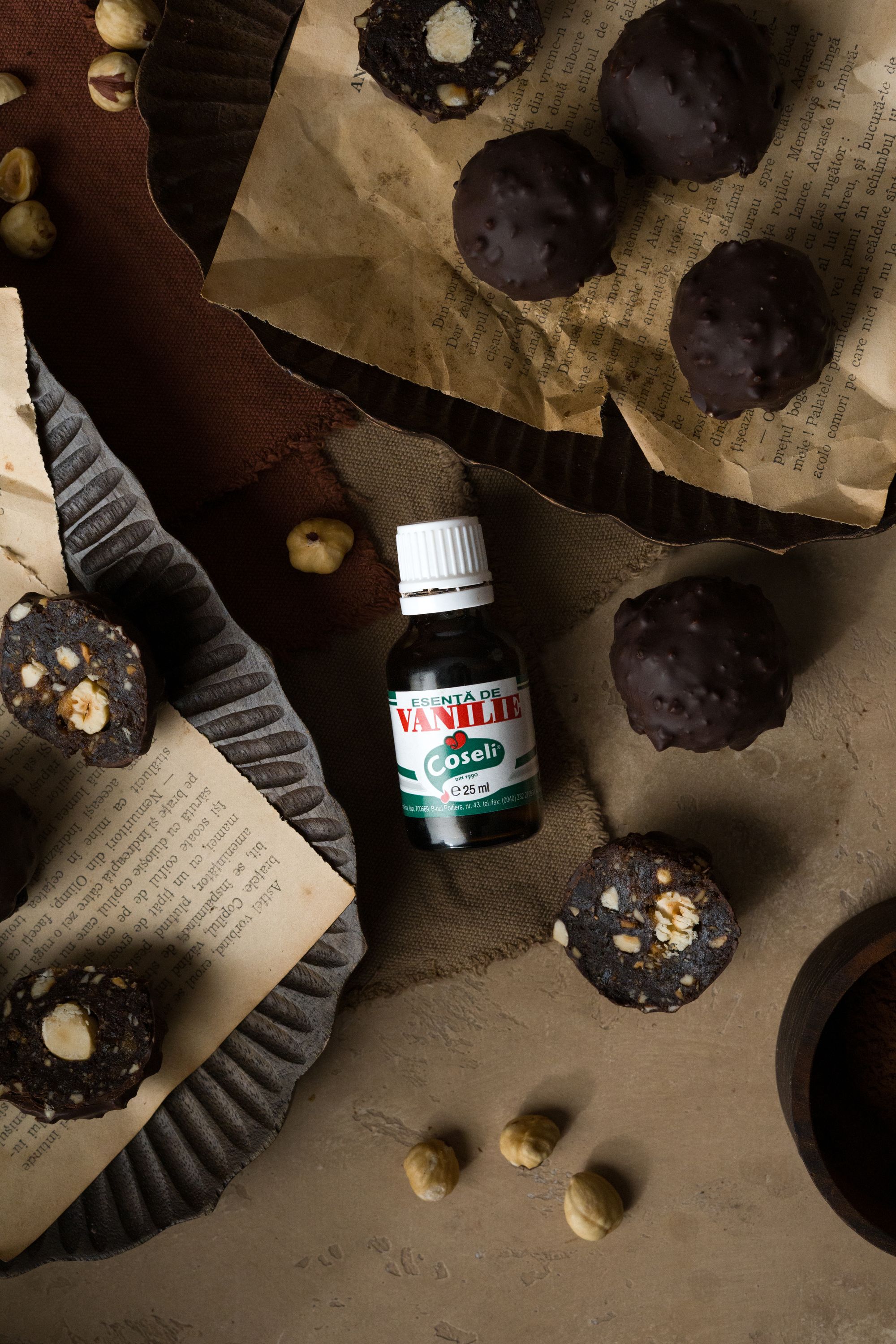 - Ia câte o lingură de compoziție, pune o alună întreagă în mijloc și formează bile.