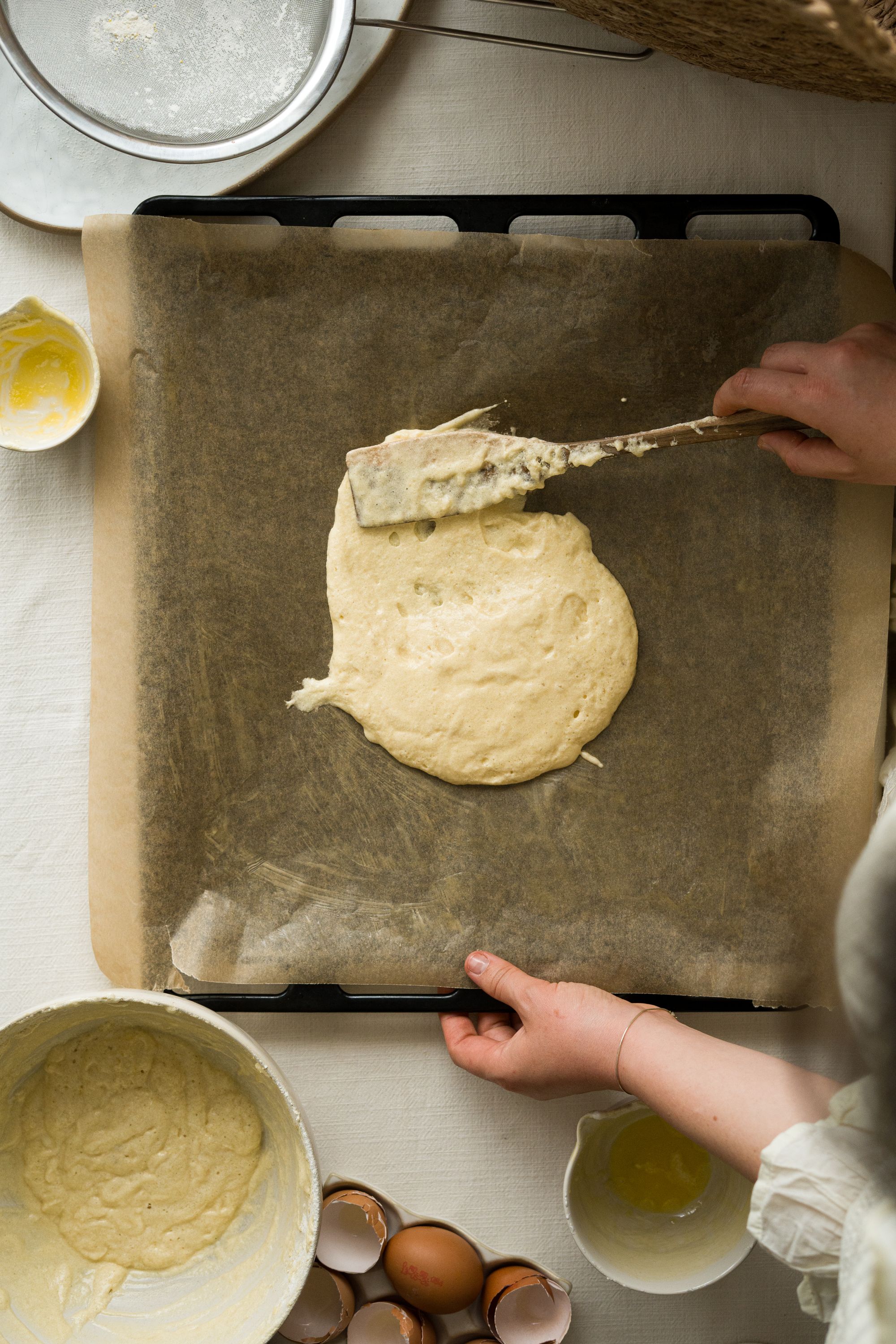 Împărți în 3, în mod egal, iar fiecare parte o întinzi pe o tavă clasică de cuptor, tapetată cu hârtie de copt. Dacă vrei să te asiguri că foaia se desprinde ușor după coagere, unge-o cu foarte puțin ulei.