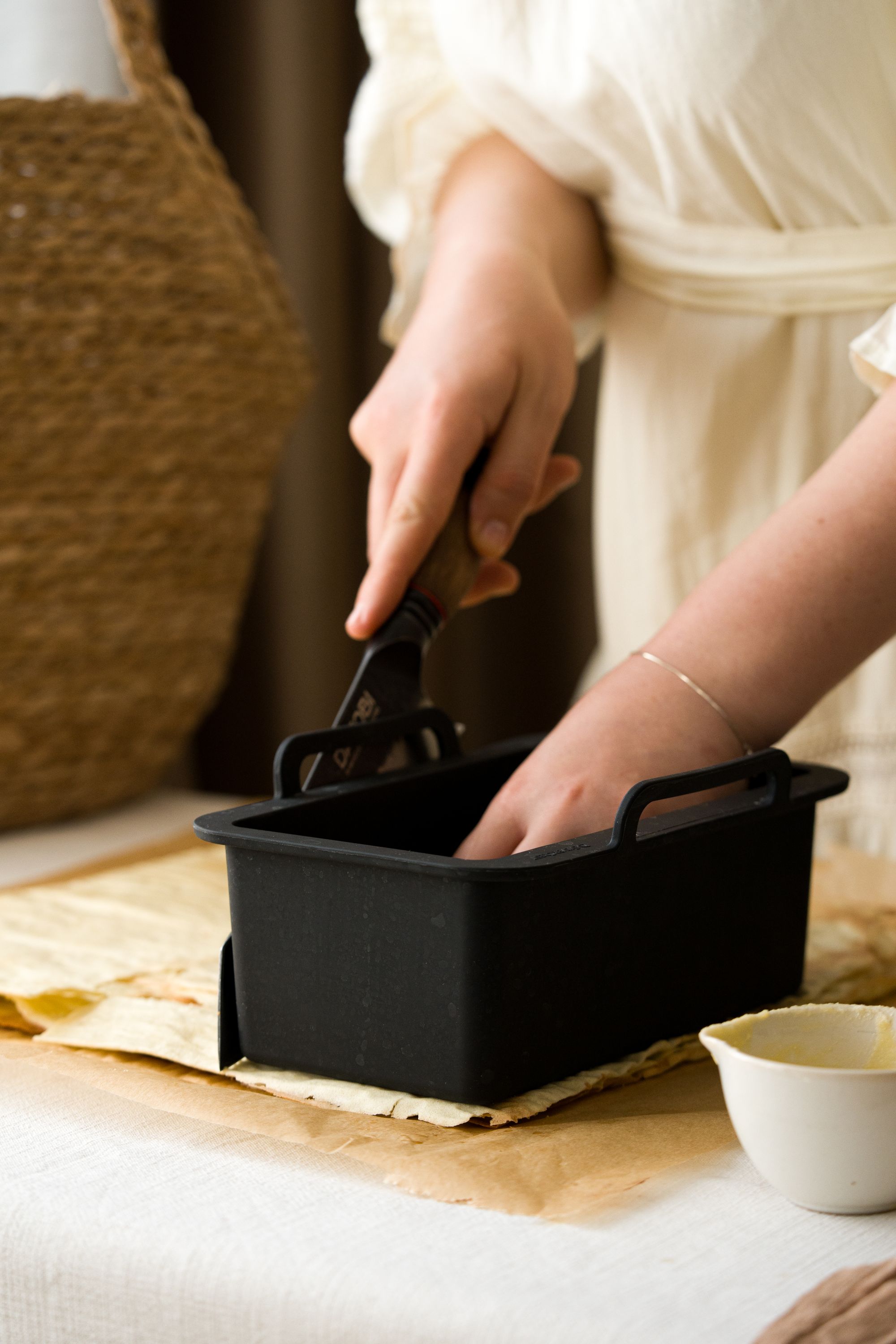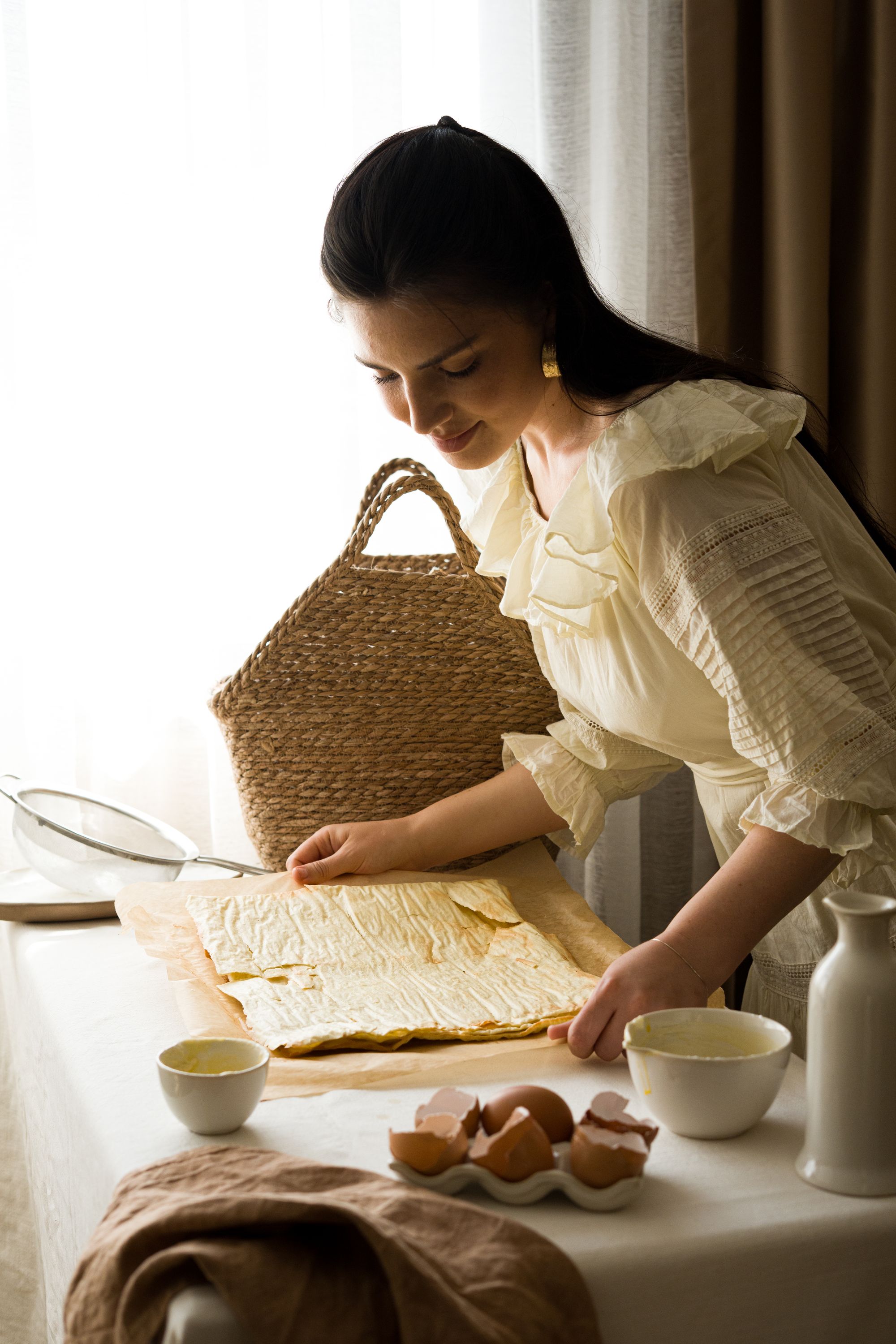 - Am copt foile într-o tavă mare, clasică, de cuptor. Iar mai apoi, chiar după ce le-am scos din cuptor, le-am tăiat la dimensiunea formei mele. Am pus fundul tăvii pe foaie, am făcut semn, iar apoi am tăiat. Am copt de 3 ori, deci 3 foi mari. Din fiecare foaie am putut tăia câte 4 bucăți, deci 12 bucăți în total.