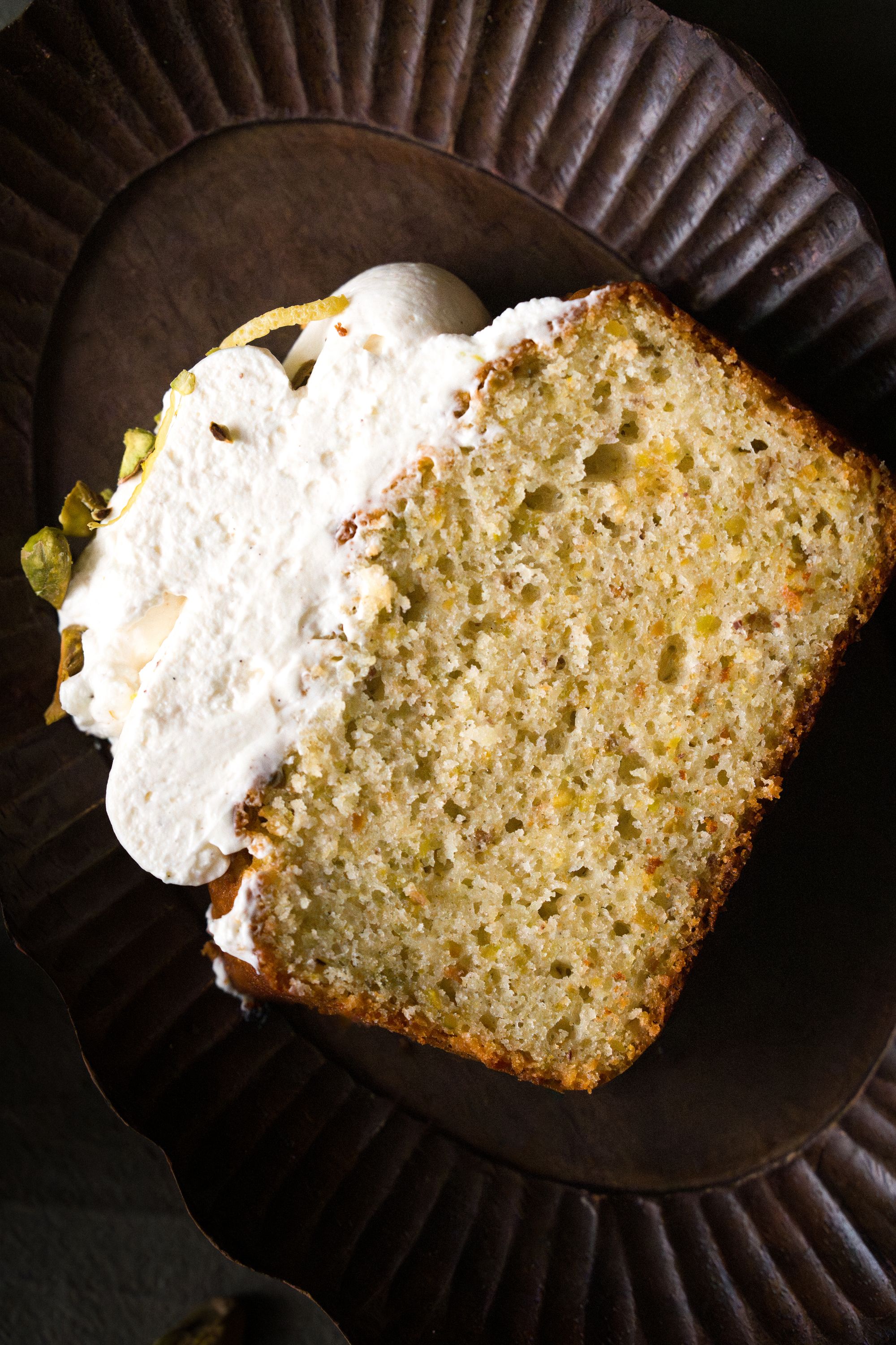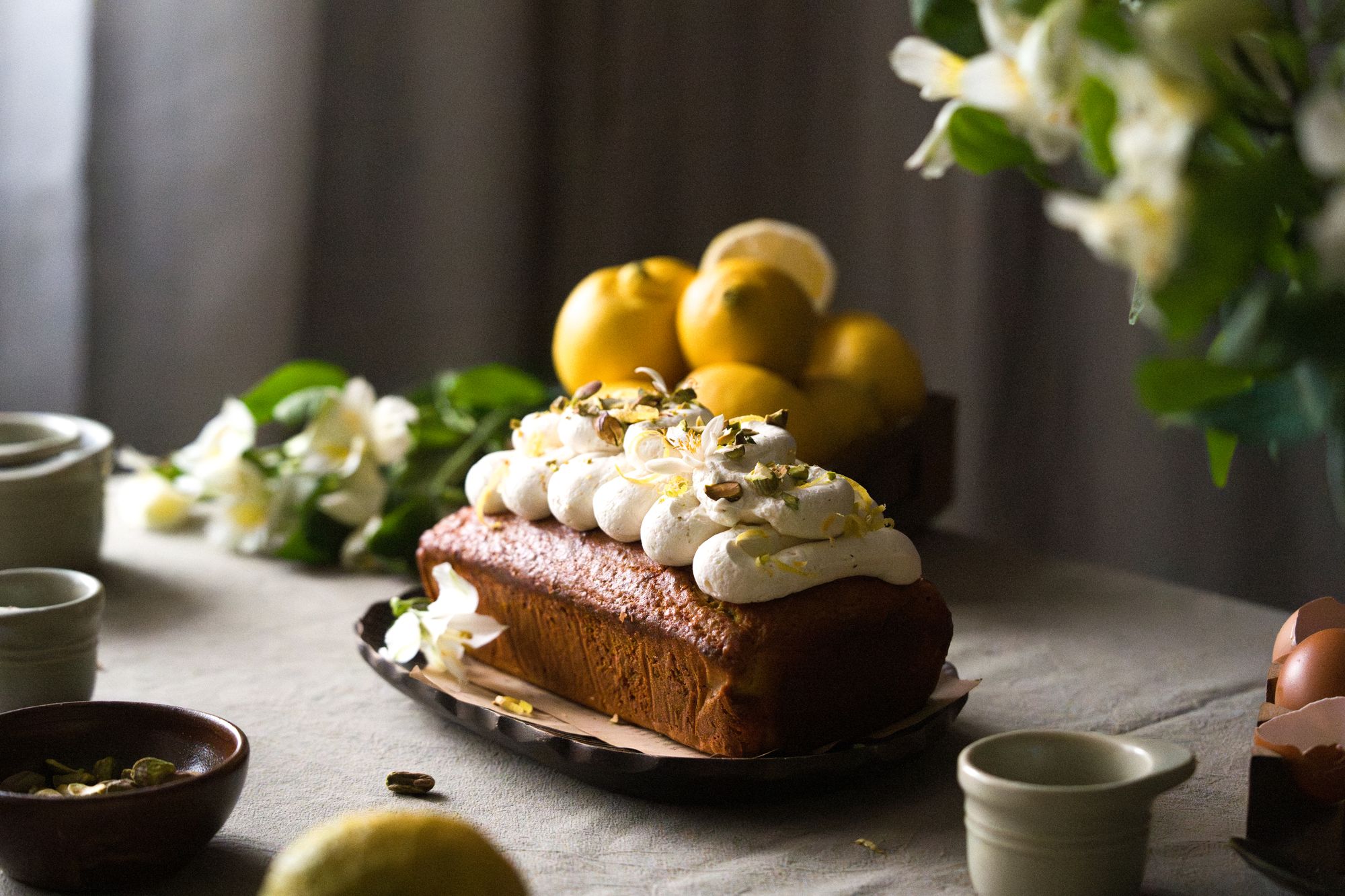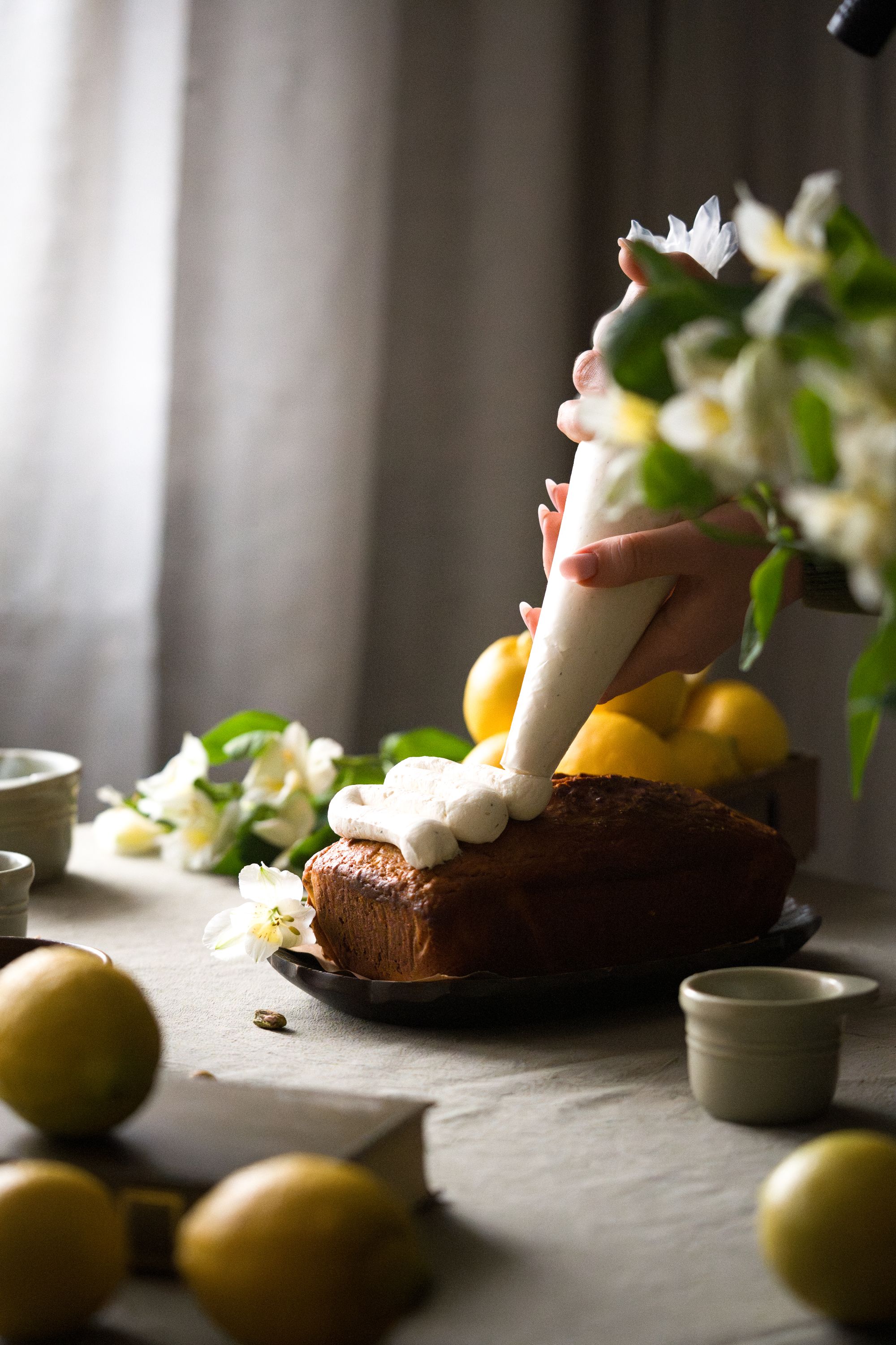 După ce checul s-a răcit, iar crema este în poș, o punem deasupra checului. Ornăm cu coajă de lămâie proaspătă și bucăți de fistic, apoi servim.