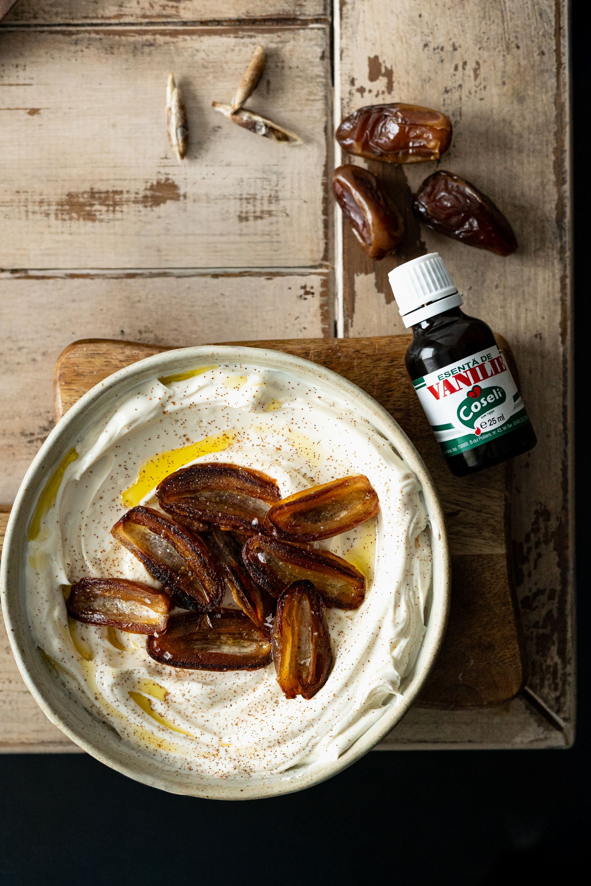 Iaurt grecesc cu vanilie și curmale trase la tigaie