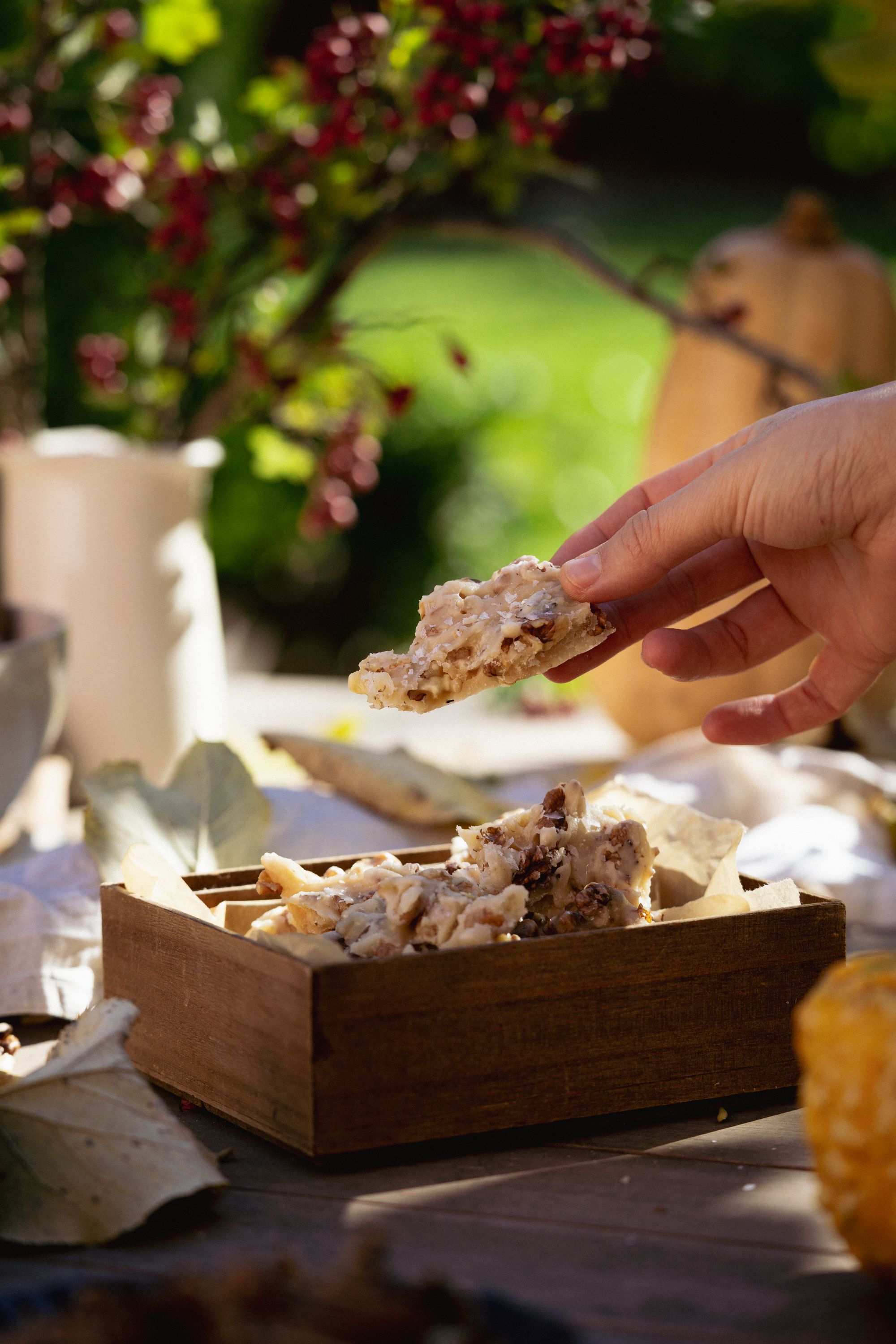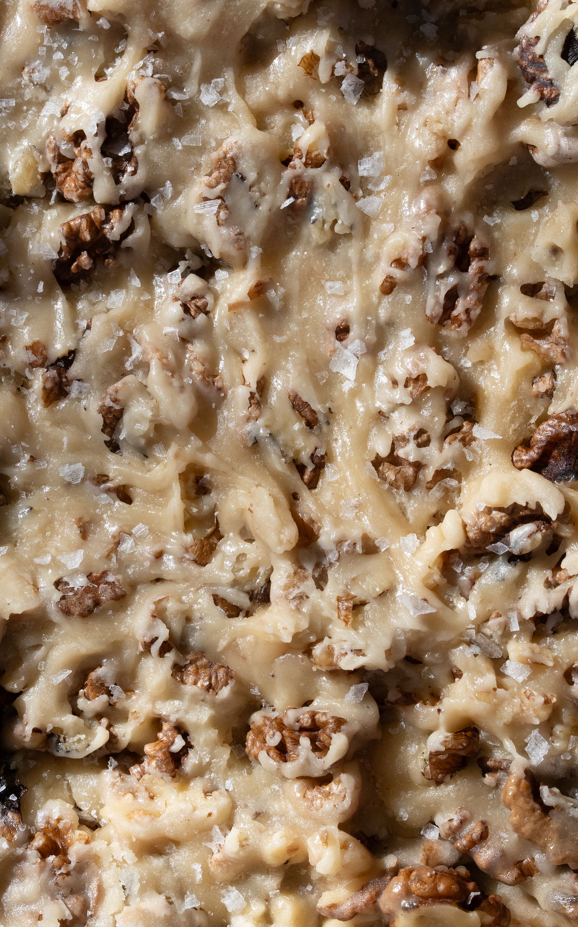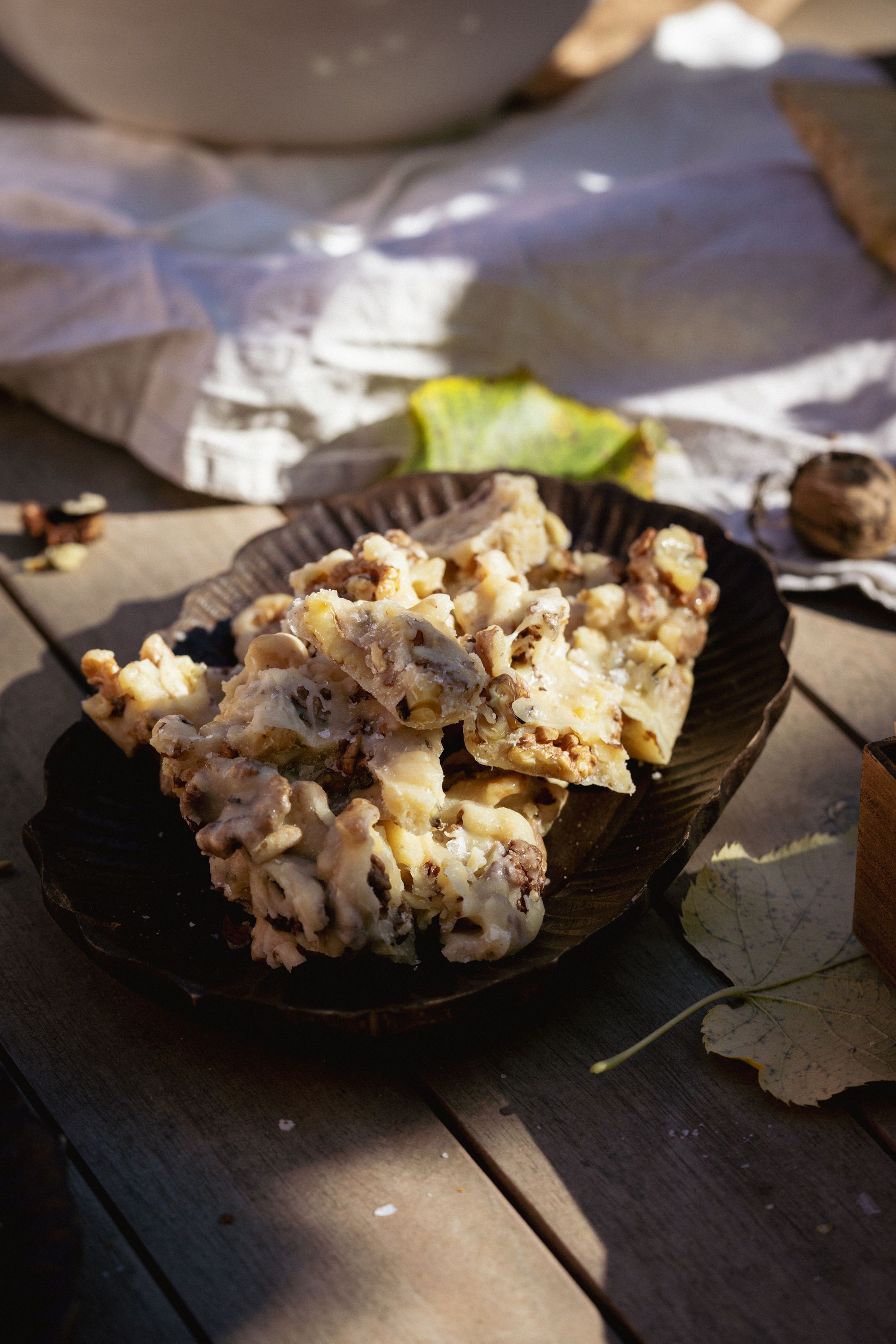 Nucă rumenită cu caramel, miere și fulgi de sare